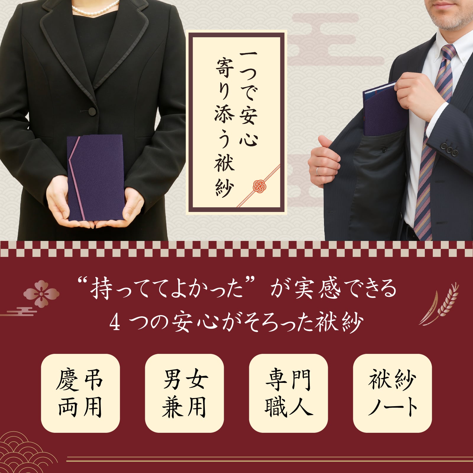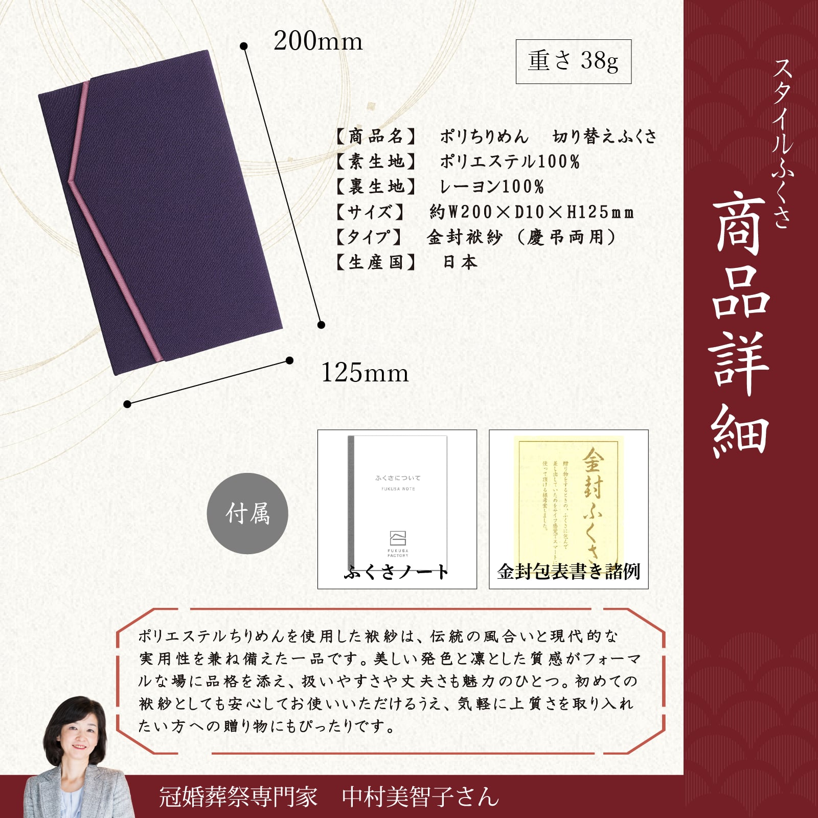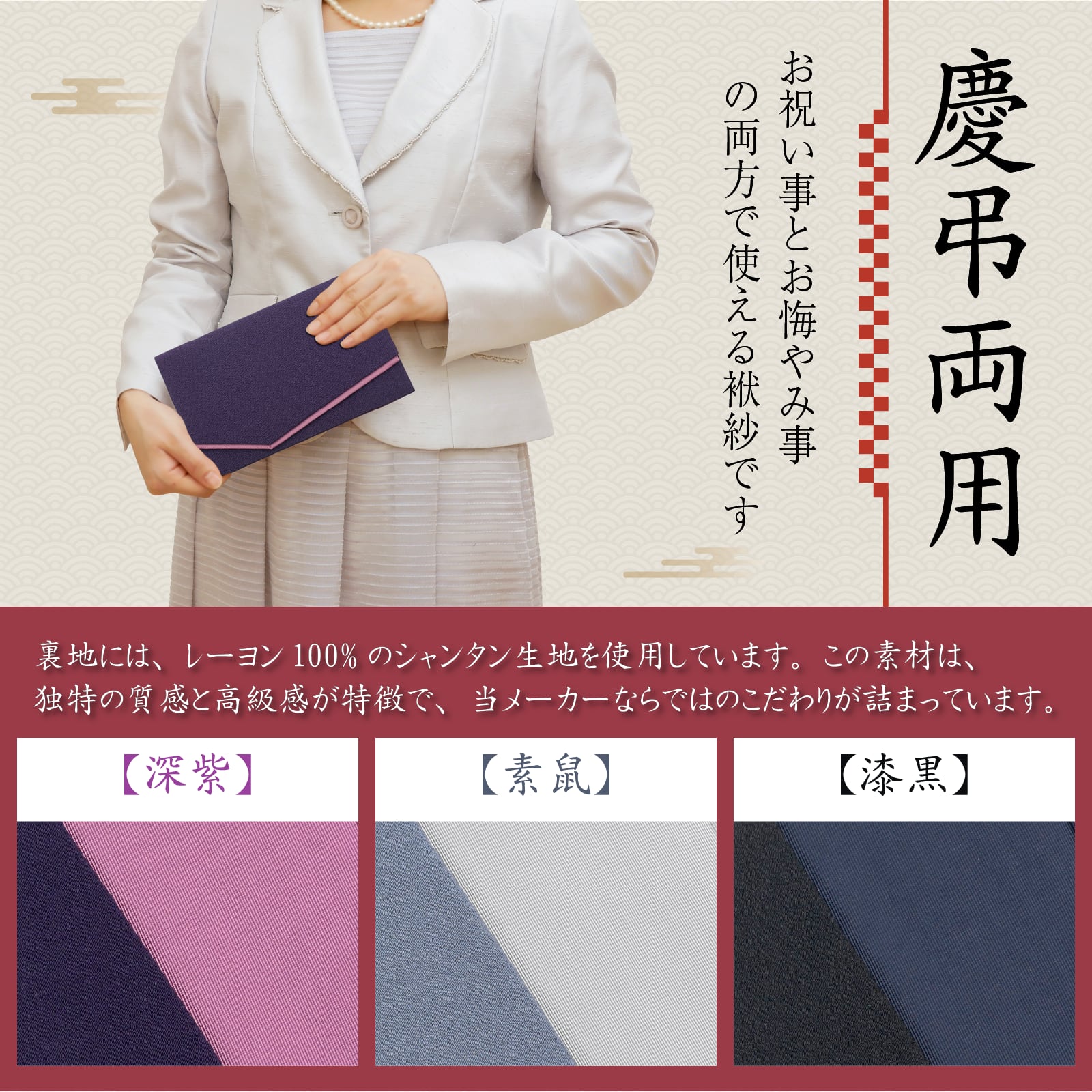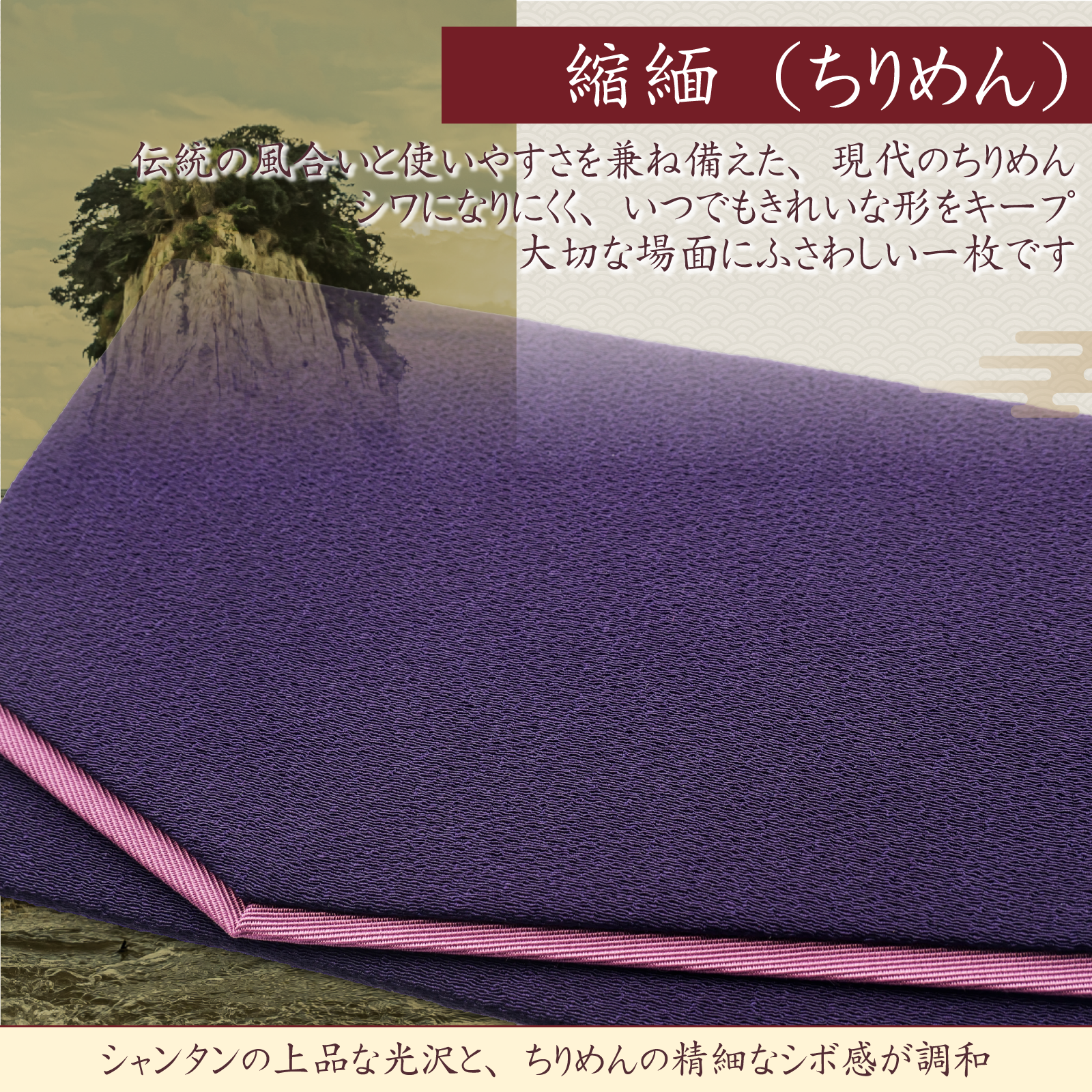 上質なポリエステル100%の「能登ちりめん」を使用した現代仕様の袱紗です。繊細なシボ(縮緬特有の凹凸)とやわらかな風合いを持ちながらも、水や型崩れに強く、美しさを長く保ちます。耐久性・機能性に優れ、慶事にも弔事にも対応できる“新しいちりめん”です。裏地には、上品な光沢が特徴のレーヨン100%シャンタン生地を採用。独特の質感と高級感があり、色味にもこだわり抜いた仕上がりです。サイズは約W200×D10×H125mm、軽量でバッグの中でもかさばらず、持ち運びにも最適。男女兼用で、どの世代の方にも自然にお使いいただけます。また、本品は当社工房にて一貫生産。生地選定・裁断・縫製・仕上げまで、すべて熟練の職人が丁寧に手がけています。初めて袱紗を持つ方にも安心しておすすめでき、格式ある場面でも信頼の一枚です。贈り物にも喜ばれる、実用性と美しさを兼ね備えた袱紗で、日本の伝統文化と美意識に触れてみてください。