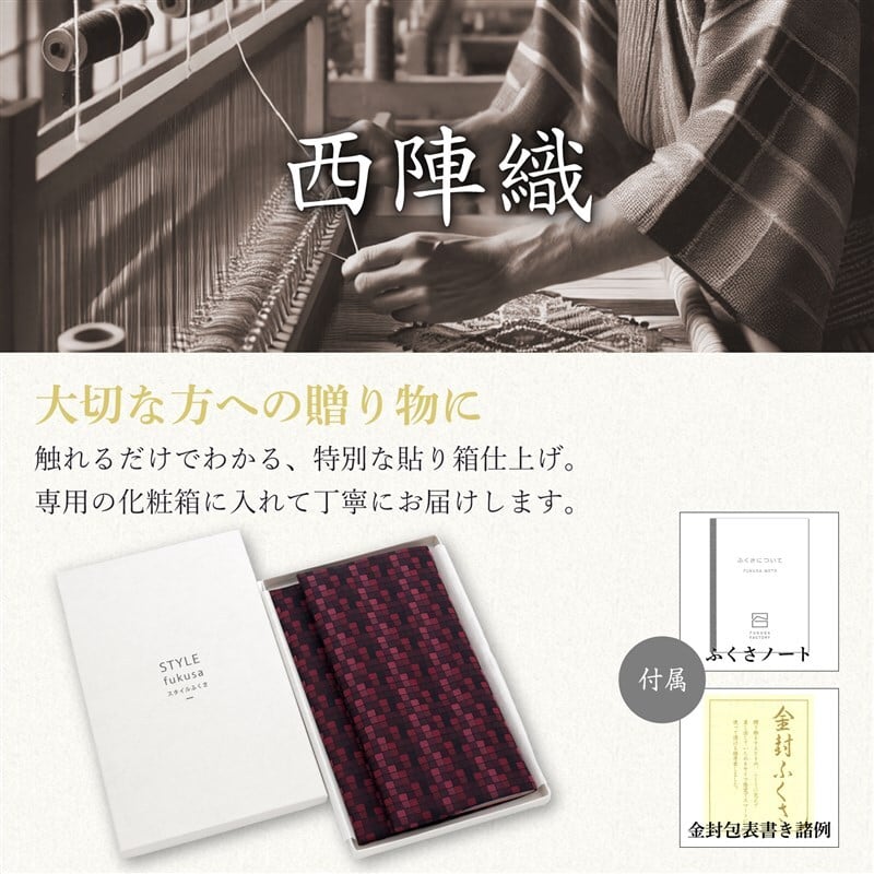 このふくさは、慶事と弔事の両方でご使用いただける便利なアイテムです。リバーシブルデザインで、一つのふくさで2つの異なる素材と色を楽しむことができます。表面には伝統の西陣織を使用し、裏面には上質なサテン生地を採用しました。慶事の場では西陣織の華やかな風合いが格式を演出し、弔事の場ではサテンの落ち着いた光沢が品の良さを引き立てます。シンプルで上品なデザインに仕上げており、どんな場面にも合わせやすく、洗練された印象を与えます。また、このふくさは専用の化粧箱に入れてお届けいたしますので、贈り物としても最適です。上質な素材と伝統の技術を組み合わせたふくさは、大切な方へのプレゼントや、人生の節目にふさわしいアイテムとなることでしょう。「リバーシブル慶弔ふくさ 西陣織バージョン」は、シンプルかつ上品なデザインで、伝統と現代の融合を感じさせるこの一品を、ぜひ特別な場でお役立てください。