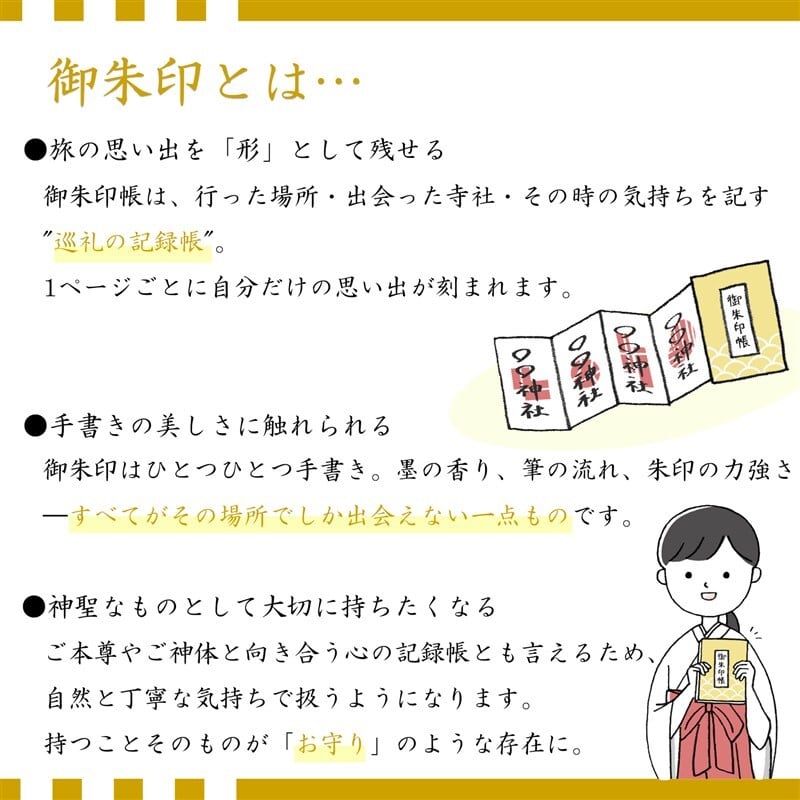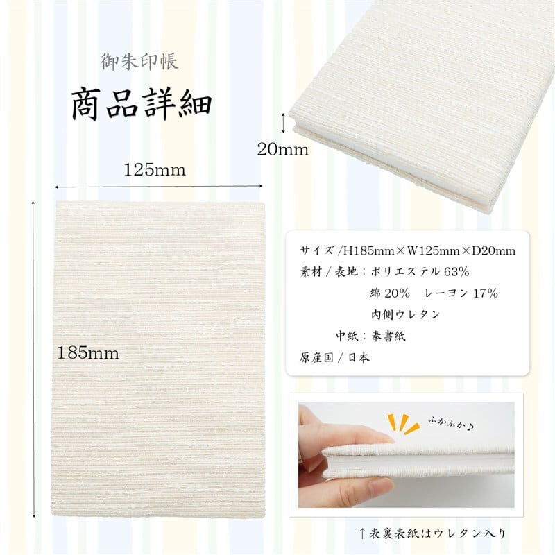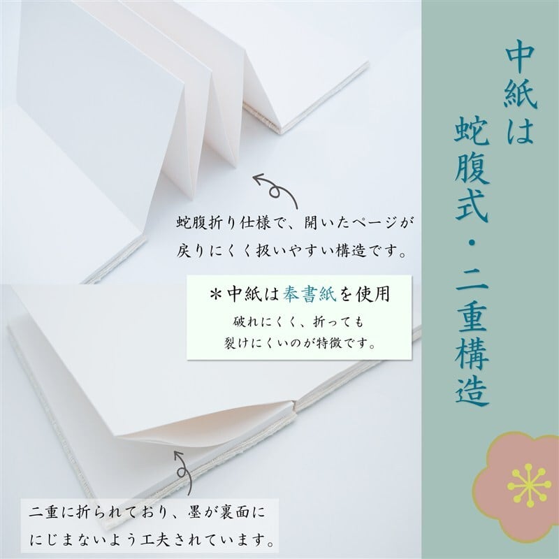 4. 使いやすい「大判サイズ」&「奉書紙」 サイズは、迫力ある御朱印がいただける人気の「大判(Lサイズ)」。近年増えている「書き置き(紙の御朱印)」も、切らずにそのまま貼ることができます。本文紙には、墨の吸いが良く裏写りしにくい、こだわりの「奉書紙(白)」を使用。2枚貼り合わせた「蛇腹(じゃばら)式・二重構造」で、両面を快適にお使いいただけます。