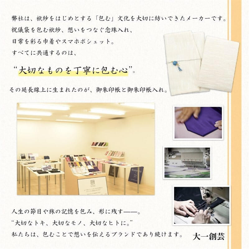 京都の自社工場で、職人が一つひとつ丁寧に仕立てた「Made in Kyoto」の逸品。 あなたの「巡礼の記録」を、美しく、心地よく包み込みます。