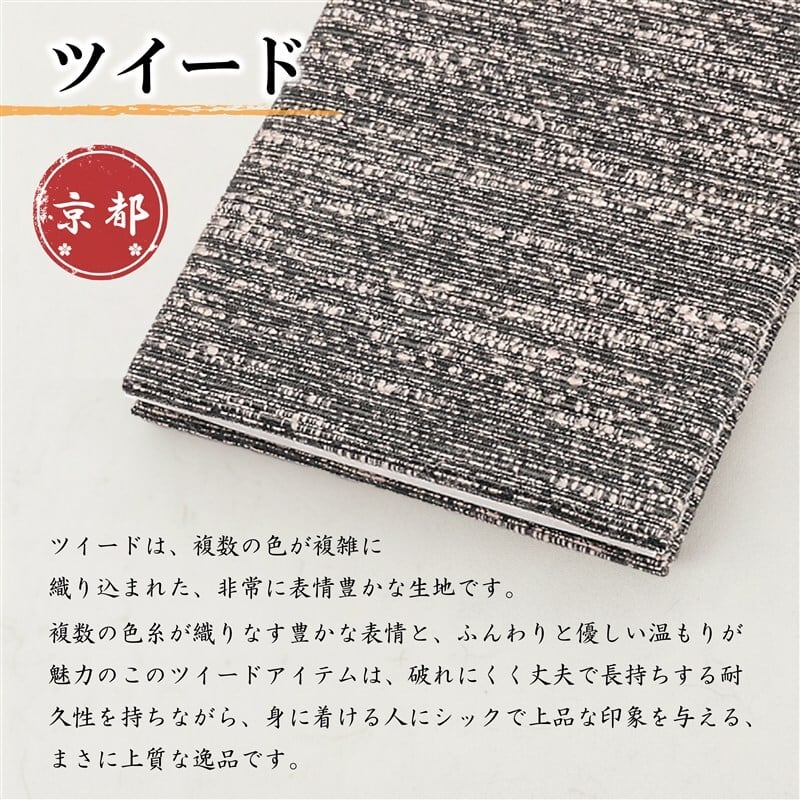 1. 表情豊かな「ツイード生地」 複数の色糸を複雑に織り込んだツイードは、単色にはない奥深い表情と、温かみのある風合いが魅力。丈夫で破れにくく、長くご愛用いただけます。カラーは、光を纏うような「シャイニーベージュ」と、シックで落ち着いた「ピンキーブラック」の2色展開です。