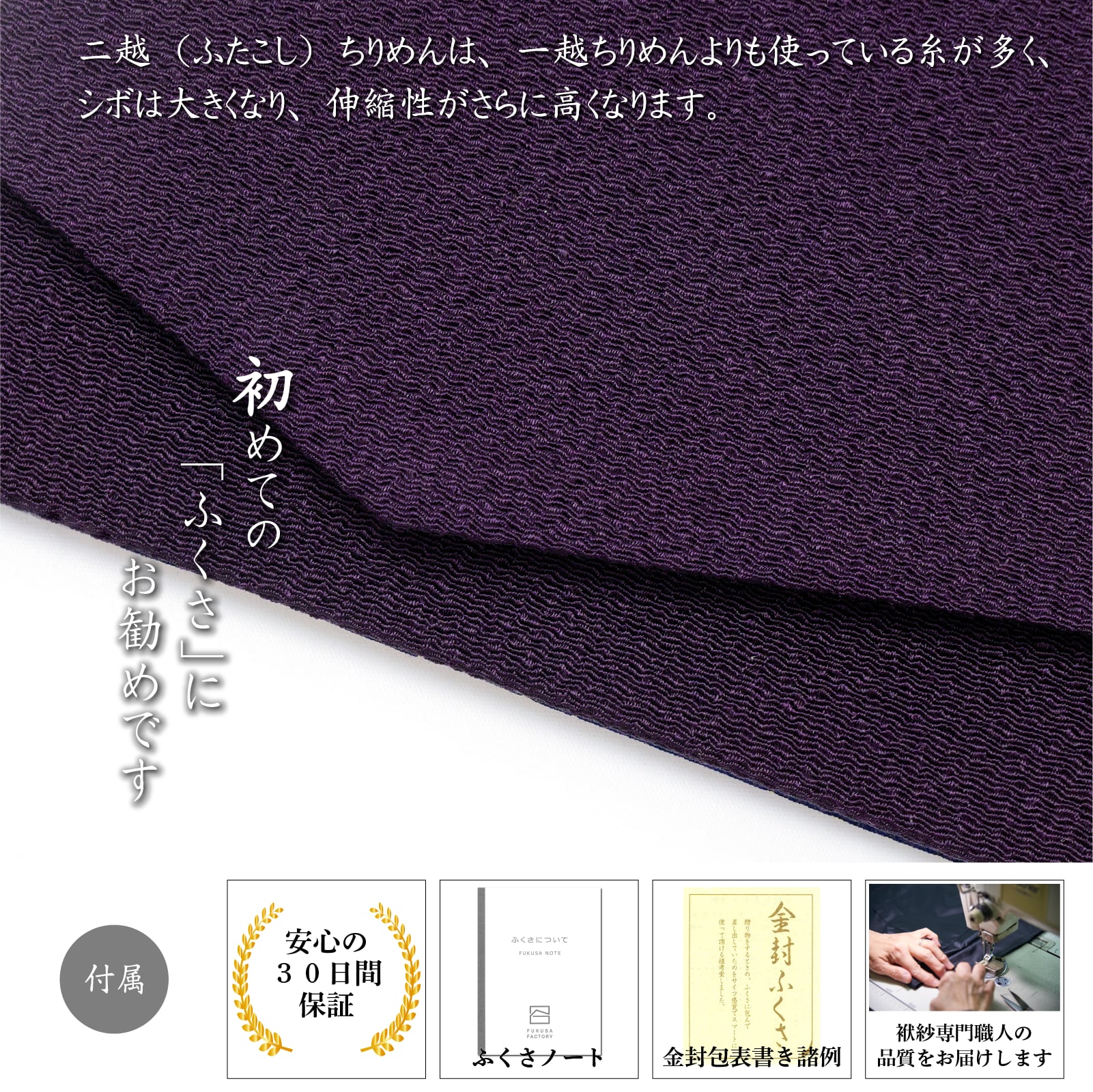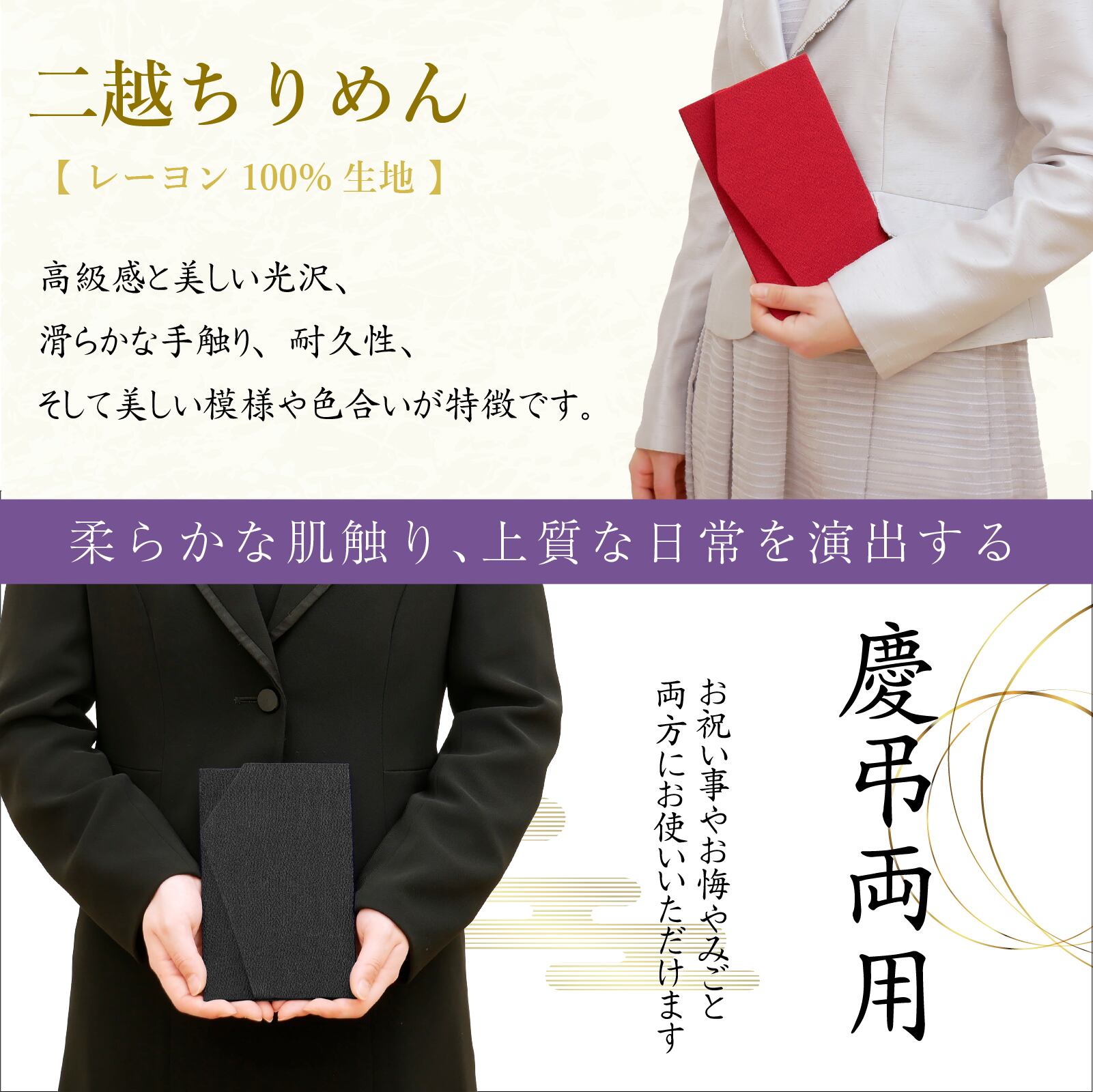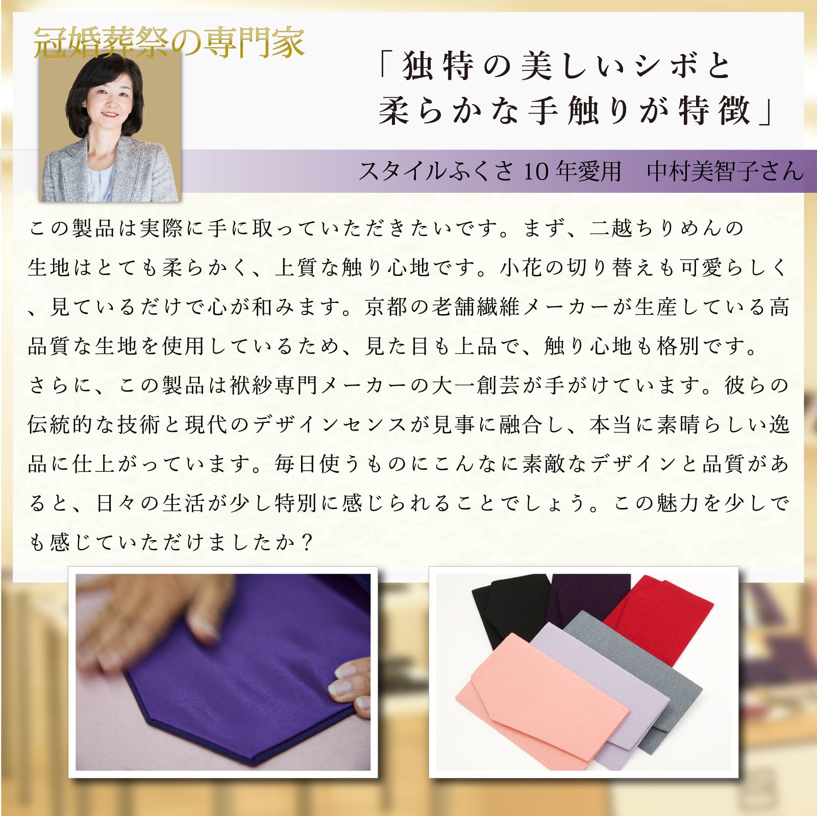 京都の老舗繊維メーカーと共同開発した高品質な「二越ちりめん」を100%使用した、慶弔両用の差し込み式金封ふくさです。二越ちりめん特有の美しいシボと、レーヨンならではの高級感あふれる光沢、滑らかな手触りが、結婚式やお葬式など大切な場面での所作を上品に引き立てます。この袱紗は、大阪の自社工場にて、日本の熟練職人が生地の仕入れ、裁断、縫製、包装まで一貫して手掛けるこだわりの日本製であり、表地と調和させた裏地の配色にも職人の技が光ります。L字型で一般的な祝儀袋や香典袋がスマートに収まるサイズ(約12.5cm×20cm)は、スーツの内ポケットにもすっきりと入り、型崩れや汚れを防ぎながら、冠婚葬祭の受付で礼儀正しくお渡しすることができます。「初めてのふくさ」として、または大切な方への贈り物としても最適な、伝統と現代のセンスが融合した逸品です。